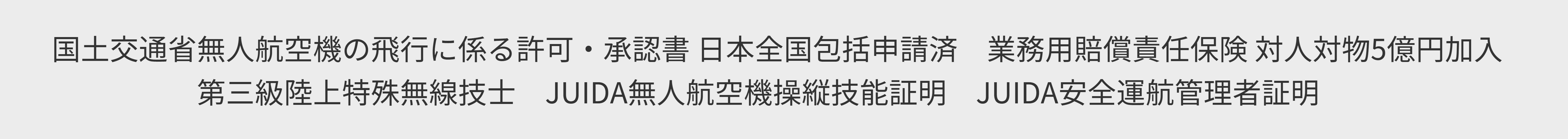 取得済許可内容 ・人又は家屋の密集している地域の上空 ・目視外飛行 ・人又は物件から30m以上の距離が確保できない飛行 150m以上、イベント撮影、夜間飛行、空港周辺の飛行は